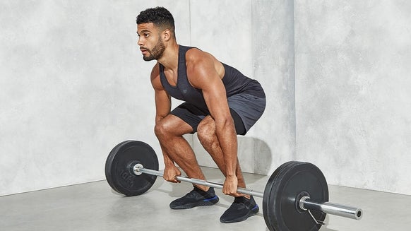 - Completate il movimento del burpee e con la schiena dritta e le spalle bloccate all'indietro, eseguite un deadlift con il kettlebell e proseguite con una remata verticale. Terminare con i gomiti vicino alle orecchie e il kettlebell sotto il mento. Abbassarsi e ripetere.