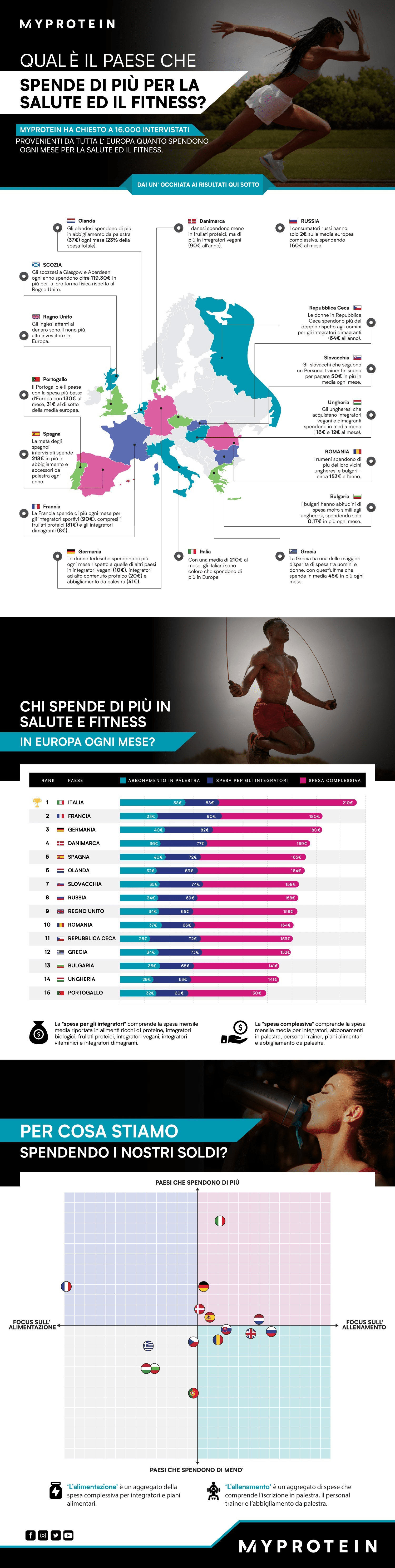 Gli italiani sono i maggiori spenditori d'Europa per la salute ed il fitness, spendono in media 2.532 euro all'anno. Più di 144000 euro in una vita intera. L' italiano medio spende 2532 euro per il fitness ed è il paese europeo che spende mediamente di più di tutti gli altri per quanto riguarda l’iscrizione in palestra. La regione italiana che spende di più in salute e fitness è l’ Umbria, con una spesa annua media complessiva di 3269 euro. - Le donne italiane tendono a spendere più degli uomini per quanto riguarda personal trainer, integratori e spesa media annua complessiva per la salute ed il fitness.