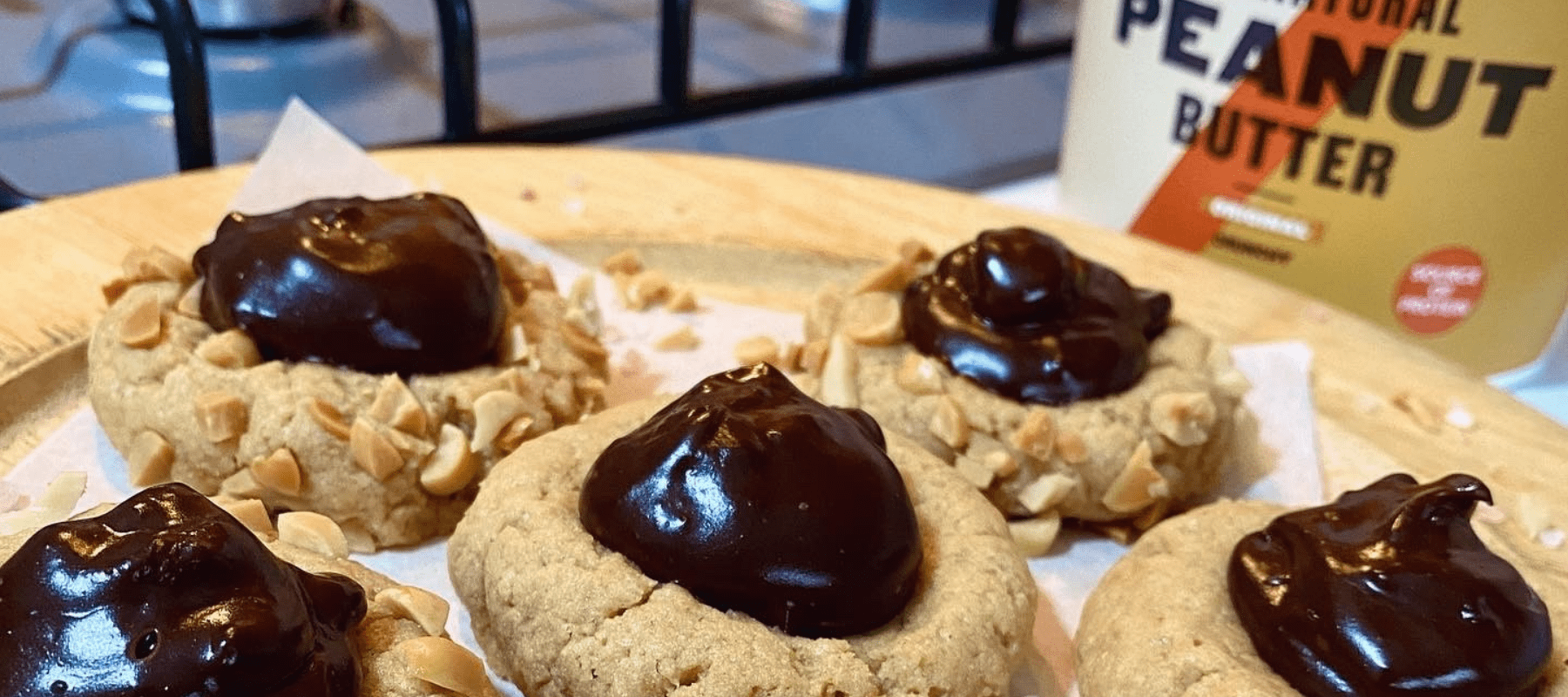 1. Unire gli ingredienti per formare un impasto morbido 2. Formare delle palline e schiacciarle leggermente al centro. 3. Arrotolare dei biscotti in arachidi tritate per un gusto croccante! Cuocere in forno statico a 180 ° per circa 15/20 min. 4. Appena cotti i biscotti sembreranno ancora morbidi anche se cotti, si induriranno solo quando si saranno raffreddati!
