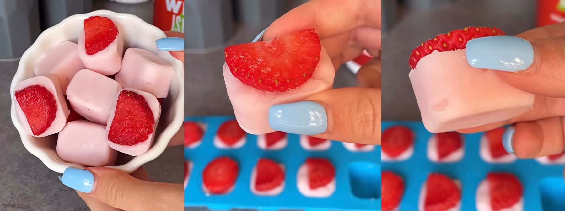 - Distribuire uniformemente il composto in una vaschetta per il ghiaccio e ricoprirlo con fette di fragole fresche.