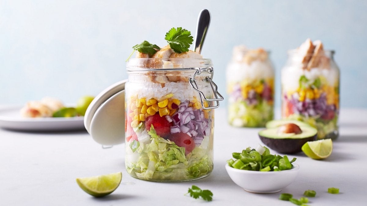 4. Dividi il mais tra i barattoli, quindi aggiungi il riso, il pollo, l'avocado, le piccole foglie di lattuga gemma e infine il formaggio. Avvita il coperchio e goditi pranzi salutari per 4 giorni!
