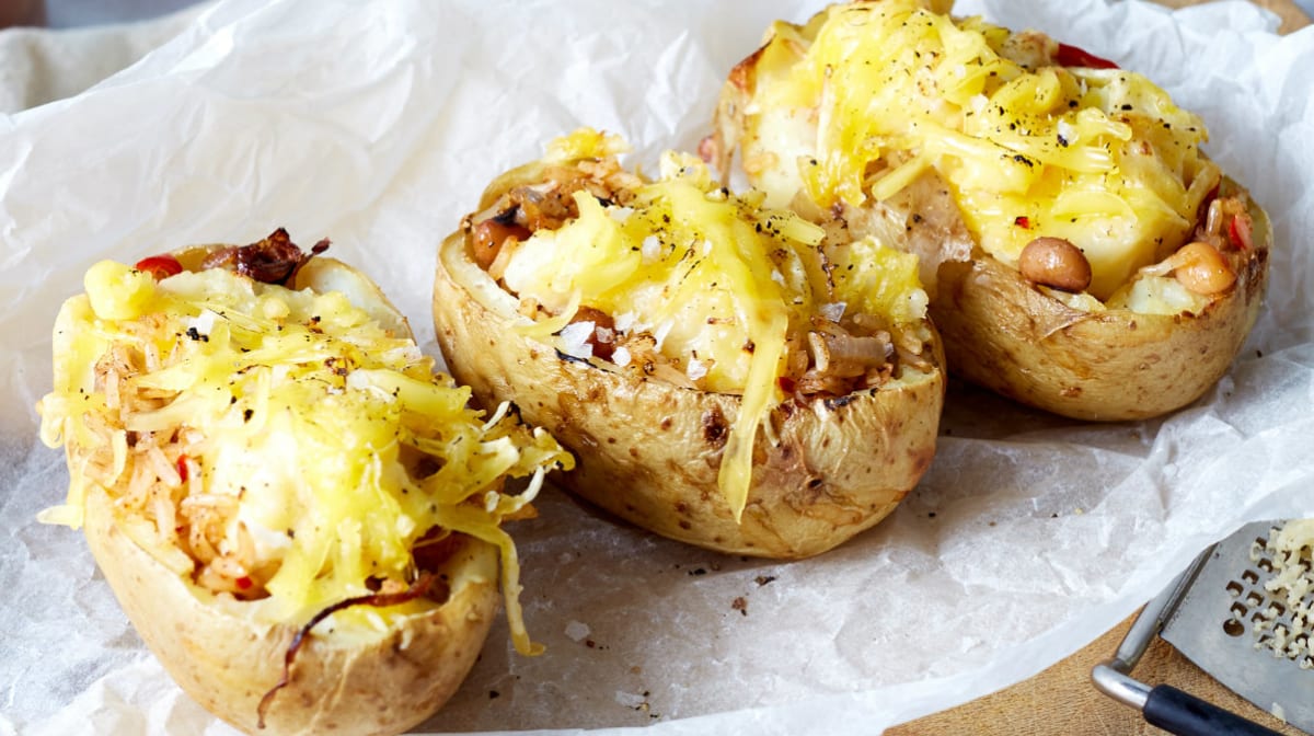 - Adesso è ora di inserire con un cucchiaio il composto con il riso dentro le patate precedentemente svuotate. Coprire con il composto di patate, formaggio, sale e pepe. Mettere il forno in modalità "grill" per 5 minuti.