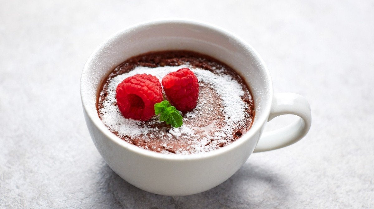 - Togliere dal microonde e lasciare raffreddare per almeno due o tre minuti prima di mangiare. Fai attenzione - questa mug cake con cioccolato fuso sarà estremamente calda dentro! Inoltre, puoi aggiungere una spolverata di zucchero a velo e della frutta come abbiamo fatto noi.