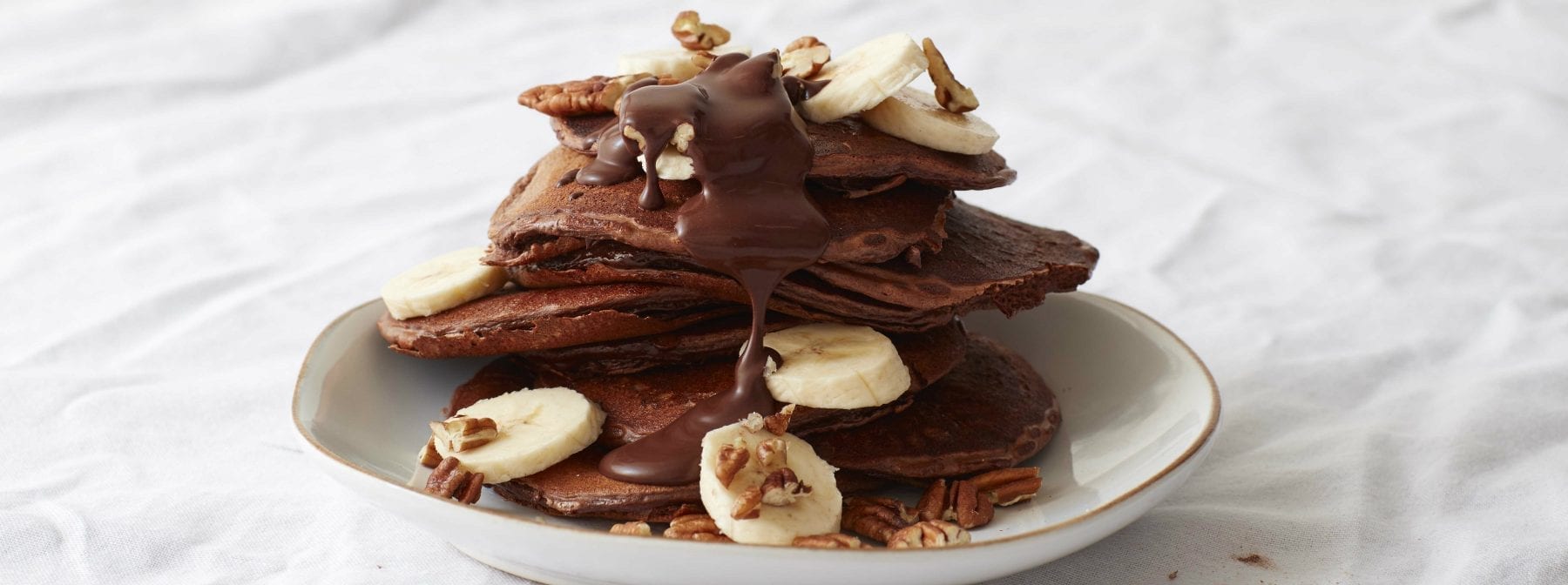 Prima di servire, guarnisci i pancake proteici con la crema al cioccolato, delle fette doi banana e una manciata di noci pecan.