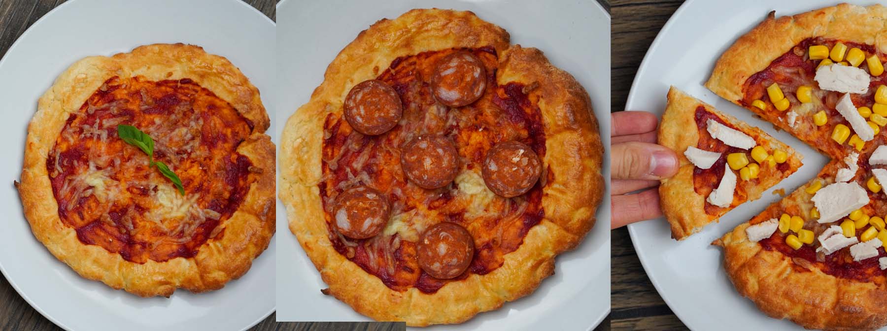 - Volete prepararla voi? Semplice. Basta aggiungere i condimenti che preferite nell'ultimo passaggio con il formaggio. Flo ha scelto un po' di mais dolce, fette di salame piccante e pollo cotto a pezzetti sulla sua pizza.