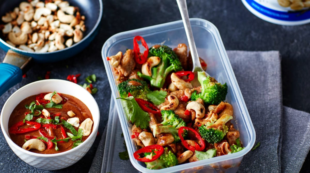 - Quando il pollo agli anacardi ed i broccoli, precedentemente messi in forno, saranno cotti, aggiungere mescolando gli anacardi abbrustoliti ed i peperoncini rossi. Dividere in porzioni e posizionare in contenitori di plastica insieme al riso basmati (precedentemente cucinato). Aggiungere una spolveratina di coriandolo tritato ad ogni contenitore e mettere questi in frigo. Facile, no?