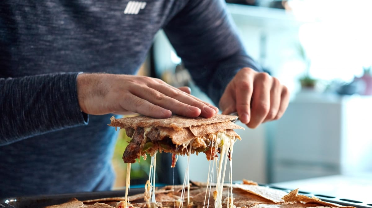 5.Inizia aggiungendo il riso cotto e distribuendolo uniformemente. Spargere le verdure sul riso e aggiungere il pollo sminuzzato in un lato della quesadilla e i lombetti sull'altro lato. Cospargi il pollo con la salsa Peri Peri senza zucchero e i lombetti con salsa BBQ senza zucchero. Coprire il tutto con abbondante formaggio a basso contenuto di grassi.
